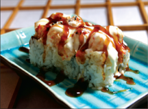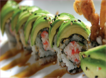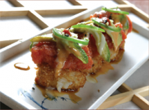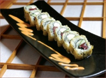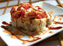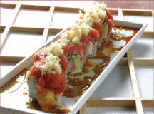 Shrimp tempura, crab mix, avocado, cucumber wrapper in soy paper topped with spicy tuna albacore and jalapeno