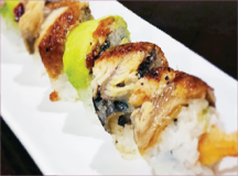 Spicy tuna, crab mix , avocado, cucumber, wrapped with soy paper, deep fried seabass on top